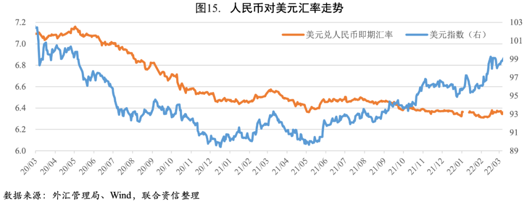 匯率方面,2022年一季度人民幣對美元即期匯率呈“先升后貶”態勢。1-2月,人民幣對美元即期匯率延續去年四季度以來的升值趨勢,主要受益于三方面因素:一是在穩增長政策支持下中國經濟持續穩定恢復,出口繼續保持韌性;二是歐洲央行與英國央行釋放鷹派信號,在一定程度上抑制了美元指數上行;三是俄烏沖突爆發后人民幣表現出一定的避險屬性。進入3月,人民幣對美元即期匯率呈現震蕩貶值態勢,主要是由于三方面原因:一是3月初國內爆發新一輪大規模疫情,對經濟運行造成嚴重沖擊;二是中美貨幣政策加速分化,導致中美利差持續收窄;三是3月11日美國證監會問責五家中概股公司,導致外資快速流出。