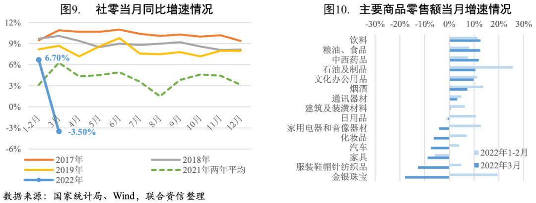 本輪疫情對消費市場沖擊較大,房地產鏈條商品銷售低迷。2022年一季度社會消費品零售總額10.87萬億元,同比增長3.30%,1-2月在春節和冬奧的帶動下消費修復有所加快,但3月本輪大規模疫情波及全國30個省市,居民出行消費明顯減少,當月社零同比增速大幅回落至負值區間,其中餐飲收入同比大幅下降16.40%,限額以上商品方面,飲料、糧油食品、藥品等基本生活類商品消費韌性顯現;油價上漲支撐石油及制品銷售額實現較快增長;金銀珠寶、服裝鞋帽等消費升級類商品3月零售額同比下降超過10%;受商品房銷售額大幅下降拖累,家具、建筑及裝潢材料等房地產鏈條商品銷售低迷;3月汽車銷售增長再次轉負,主要受到汽車產能承壓、部分汽車價格上調、產品交付周期延長以及消費動能不足等因素影響。