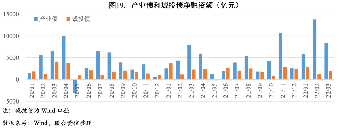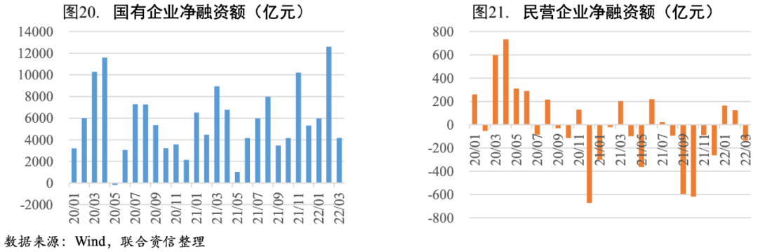 非金融企業債券凈融資規模擴張,結構分化較為顯著。一季度在穩增長政策發力下,企業部門信用債凈融資1.31萬億元,較上年同期多增4051億元,企業債券凈融資規模繼續擴張,但結構分化較為顯著。從行業結構看,產業債市場信用明顯擴張,城投債信用擴張有所放緩。從企業性質看,國企債和民企債市場信用均有所擴張,但值得關注的是,3月民企債市場信用由擴張轉為收縮;從區域結構看,區域信用延續分化態勢,其中3月內蒙古、廣東、甘肅等省市信用收縮較為明顯(詳見《信用總量大幅擴張,結構分化依然顯著——從2022年3月社融數據看我國宏觀信用狀況》)。