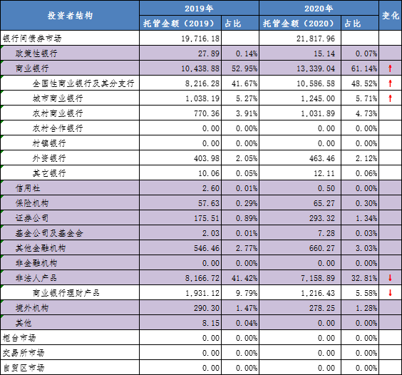 從2020年末的數(shù)據(jù)來(lái)看,商業(yè)銀行和非法人產(chǎn)品(資管類賬戶)是持倉(cāng)的絕對(duì)主力,持倉(cāng)占比分別為61.14%和32.81%。