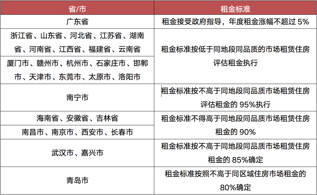 克而瑞租售在整理中發(fā)現(xiàn),大部分城市均明確保租房租金接受政府指導(dǎo),租金標(biāo)準(zhǔn)按低于同地段同品質(zhì)市場租賃住房評估租金執(zhí)行,年度租金漲幅不超過5%。