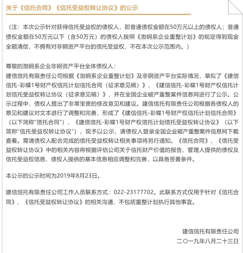 事實(shí)上,信托受益人也即債權(quán)人將其對渤海鋼鐵系企業(yè)的債權(quán)作為對價(jià),一旦重整計(jì)劃獲得批準(zhǔn),其對渤鋼系企業(yè)所享有的債權(quán)將由信托公司享有,信托公司不向非鋼平臺(tái)提供資金支持,而是集中受讓債權(quán)并通過管理和處置信托財(cái)產(chǎn)進(jìn)行追索。