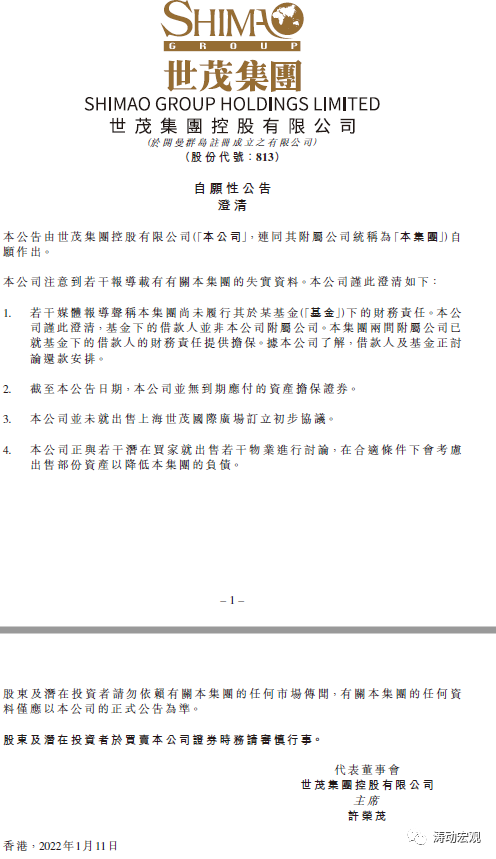 2022年1月11日,針對市場傳言世茂集團未履行其于某基金下的財務責任事宜,世茂集團發布澄清公告稱某基金下的借款人并非其附屬公司,其兩家附屬公司已就基金下的借款人的財務責任提供擔保、借款人及基金正討論還款安排,同時其目前無到期應付的資產擔保證券、亦未就出售上海世茂國際廣場訂立初步協議,且正與若干潛在買家就出售若干物業進行討論,以在合適條件下會考慮出售部分資產以降低本集團的負債。意味著世茂系實際上正在處置相關資產。