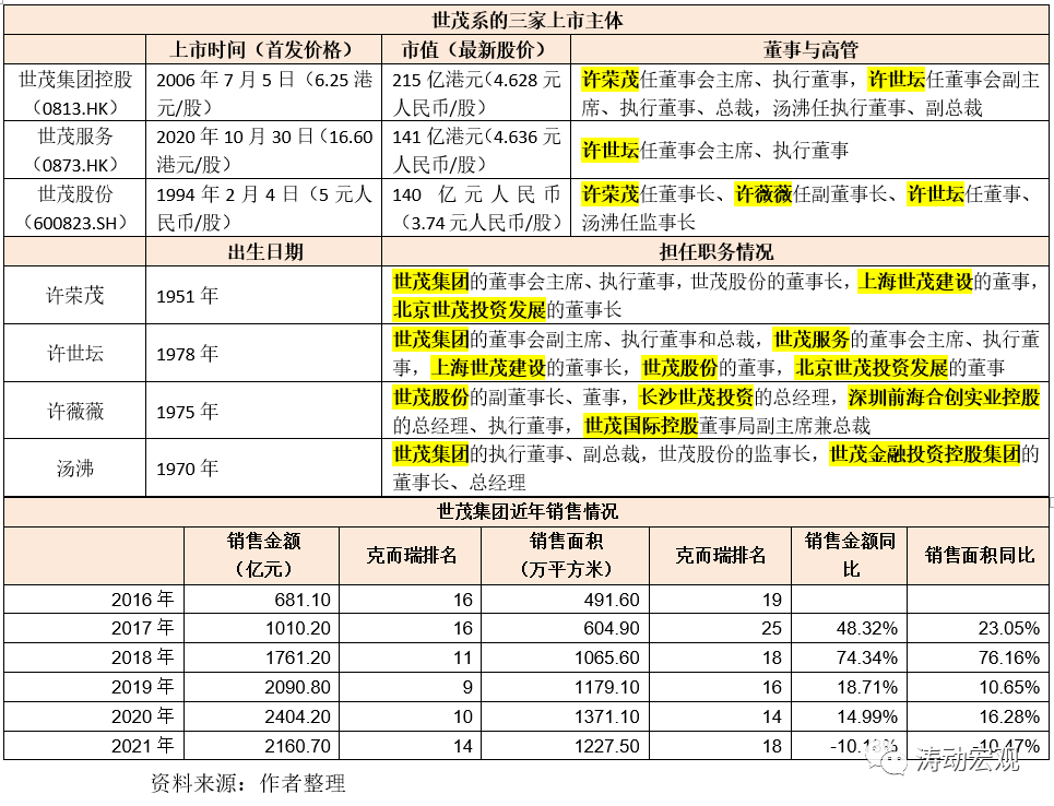 世茂系共有三家上市主體,分別為1994年2月借殼上市的世茂股份(A股)、2006年7月上市的世茂集團控股(港股)以及2020年10月上市的世茂服務(港股)。從市值上看,世茂集團、世茂股份和世茂服務分別為215億港元、140億元人民幣和141億港元,最新股價分別為4.63人民幣/股、3.74人民幣/股和4.64人民幣/股。其中,許榮茂任世茂集團和世茂股份的董事長,許世壇任世茂集團的董事會副主席、執行董事和總裁以及世茂服務的董事會主席、執行董事,許薇薇則世茂股份的副董事長。