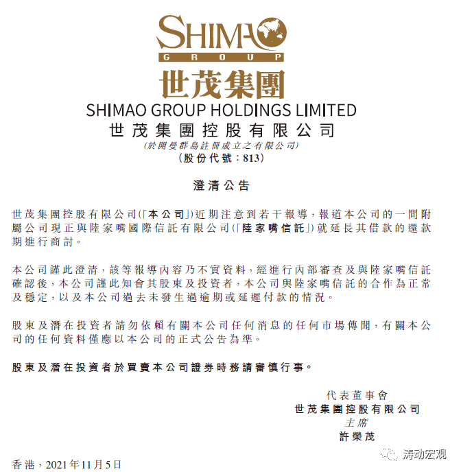 2021年11月4日,網傳“世茂旗下公司正與陸家嘴信托就延長其借款的還款期進行商討”,引發世茂系股債紛紛大跌。