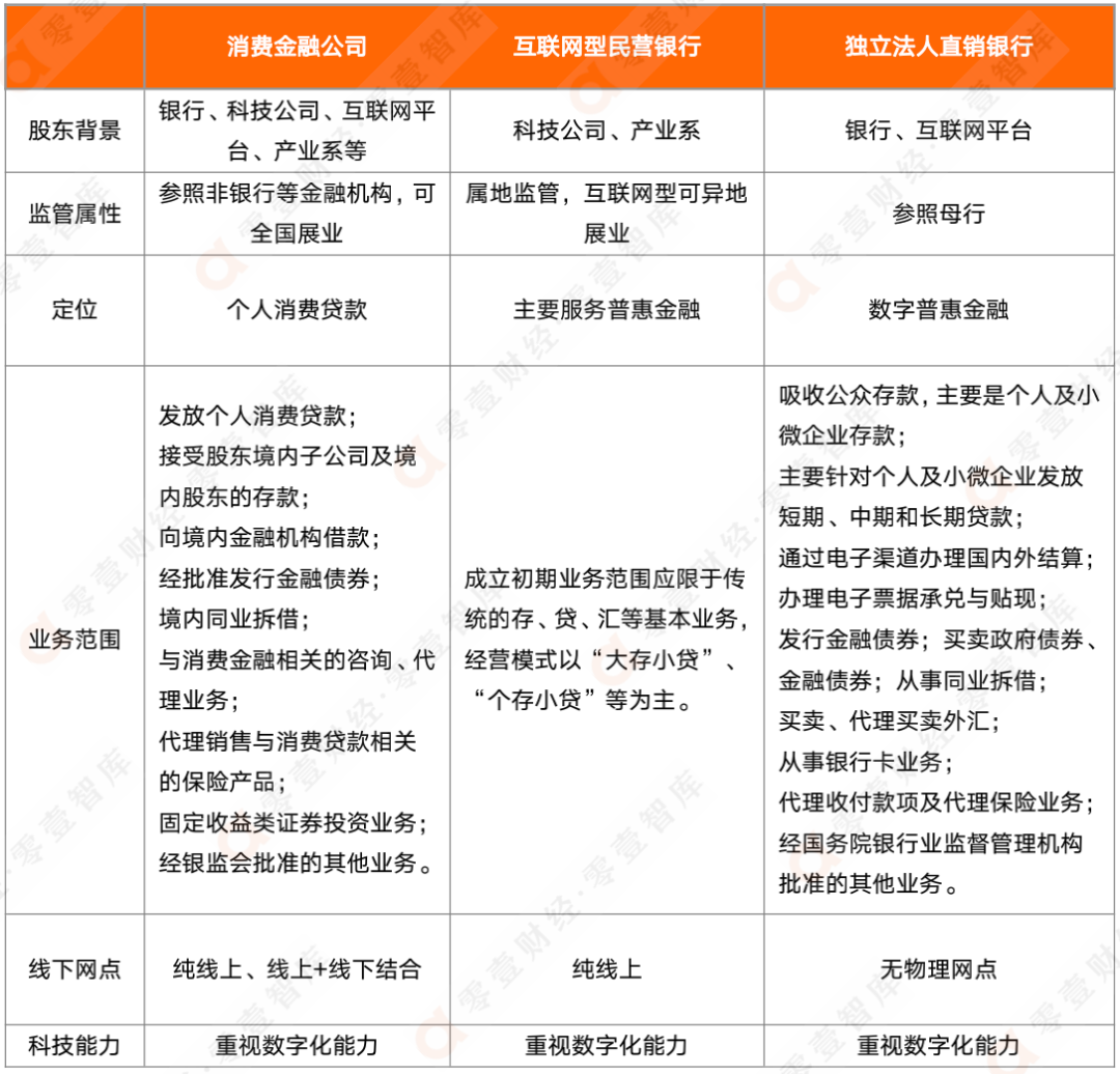 表:消費金融公司、互聯網型民營銀行、獨立法人直銷銀行展業情況對比