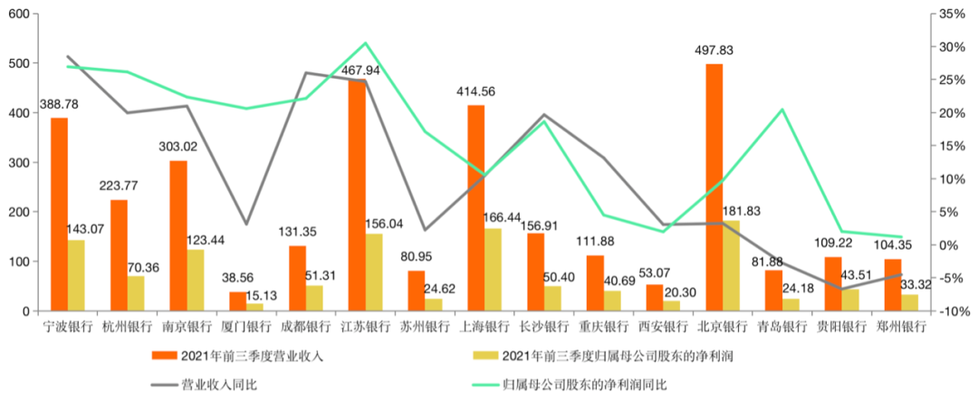 一、城商行業績PK:寧波銀行營業收入同比最高,保持穩健發展縱觀15家A股上市城商行,2021年前三季度的整體業績表現為正增長,呈現出逐步擺脫疫情影響的良好經營態勢。零壹智庫選取營業收入與歸母公司凈利潤2項指標,綜合觀察城商行之間的業績表現: