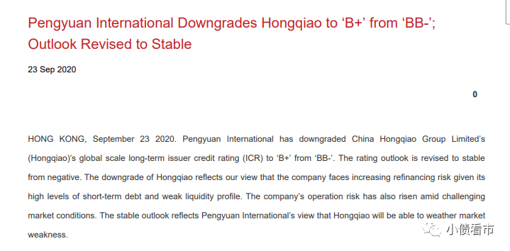 9月23日,鵬元國(guó)際將中國(guó)宏橋(01378.HK)國(guó)際刻度的長(zhǎng)期主體評(píng)級(jí)由“BB-”下調(diào)至“B+”,評(píng)級(jí)展望從負(fù)面調(diào)至穩(wěn)定。