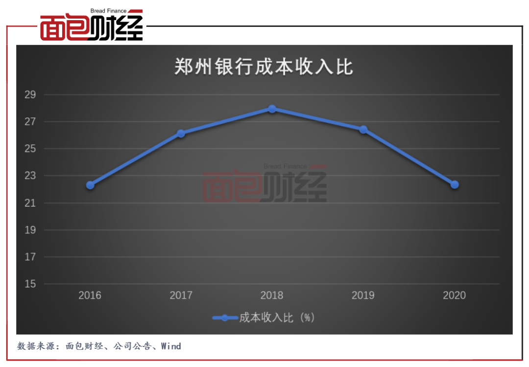 截至2020年末,鄭州銀行的成本收入比為22.40%,較上年末下降4.06個(gè)百分點(diǎn),成本收入比連續(xù)兩年出現(xiàn)下降。