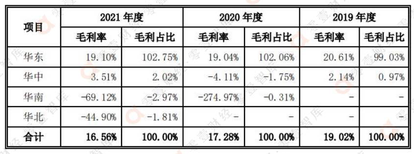 另外在毛利率方面,2021年老鄉(xiāng)雞在華東地區(qū)實(shí)現(xiàn)了19.1%的毛利率,華中地區(qū)毛利率僅為3.51%,華南和華北地區(qū)目前均處于虧損狀態(tài)。