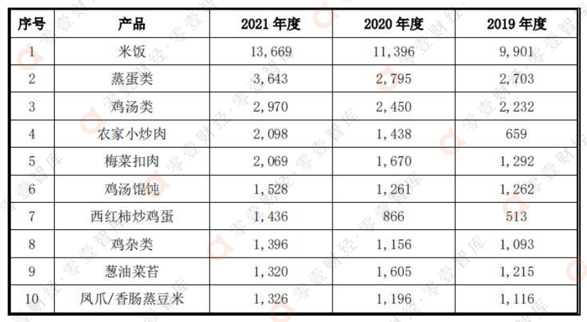 事實(shí)上也確實(shí)如此,招股書顯示,餐廳產(chǎn)品前三位的分別是米飯、蒸蛋類以及雞湯類這類相對較為平價的菜品。2021年老鄉(xiāng)雞共賣出了1.37億份米飯,3600多萬份蒸蛋以及2900多萬份雞湯。