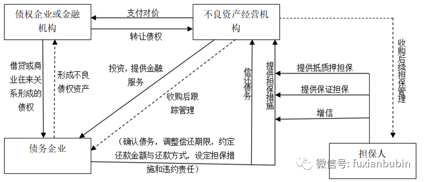 債務(wù)重組是針對(duì)出現(xiàn)流動(dòng)性困難的企業(yè),不良資產(chǎn)經(jīng)營(yíng)機(jī)構(gòu)分別與債權(quán)人、債務(wù)人就還款金額、還款方式、還款時(shí)間等債權(quán)債務(wù)問(wèn)題達(dá)成協(xié)議,通過(guò)更改債務(wù)條款,實(shí)行債務(wù)合并的方式,優(yōu)化該類(lèi)企業(yè)的資產(chǎn)負(fù)債結(jié)構(gòu)、盤(pán)活企業(yè)不良資產(chǎn),幫助企業(yè)渡過(guò)財(cái)務(wù)危機(jī)的一種不良資產(chǎn)經(jīng)營(yíng)模式,其基本業(yè)務(wù)流程如下圖: