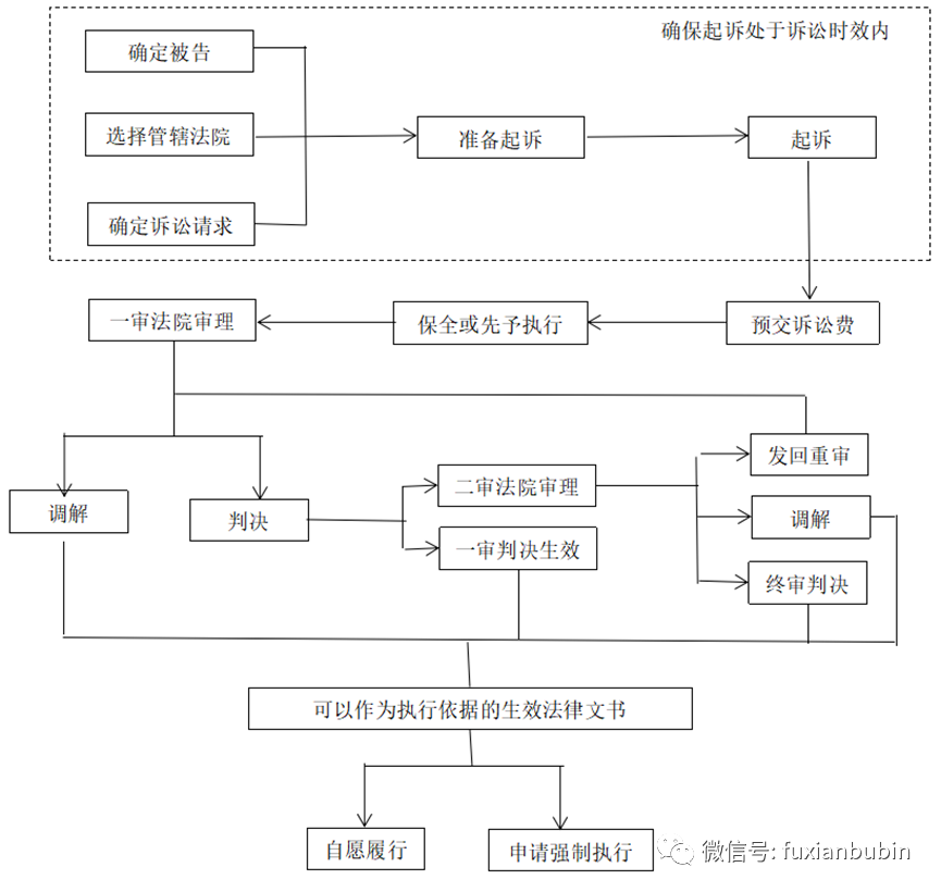 即通過(guò)民事訴訟、民商事仲裁、民事督促(支付令)、執(zhí)行公證債權(quán)文書(shū)、直接向法院申請(qǐng)實(shí)現(xiàn)擔(dān)保物權(quán)的方式,確立債權(quán)的合法性,依靠強(qiáng)制程序收回債權(quán)的清收處置方式。其中,訴訟流程較為復(fù)雜,主要如下圖所示: