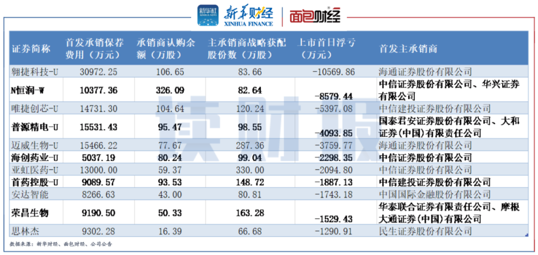 海通證券主承銷的翱捷科技-U和邁威生物-U的首日跌幅約為三成,該券商通過包銷和跟投合計購入上述兩家公司的股數分別約為190萬股和360萬股,在兩只新股的上市首日便分別產生浮虧超1億元和超3500萬元,損失較為嚴重。
