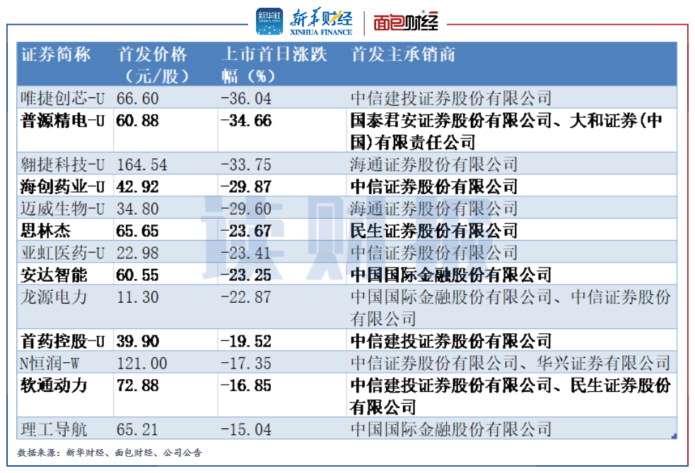 從首發主承銷商來看,中信證券和中金公司所承銷新股中,分別有8只和5只首日即破發。唯捷創芯-U、普源精電-U和翱捷科技-U三只新股的上市首日跌幅超過三成,其首發主承銷商分別為中信建投、國泰君安和大和證券以及海通證券。