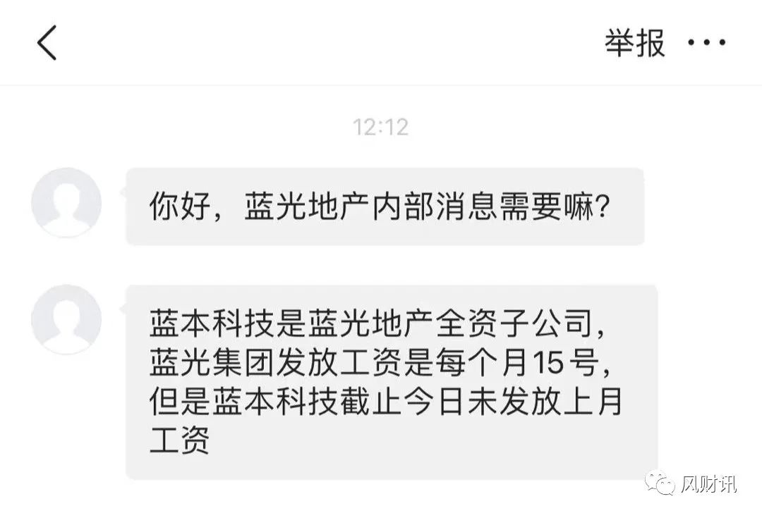 風(fēng)財(cái)訊報(bào)道 近日據(jù)藍(lán)光系員工爆料,藍(lán)光發(fā)展集團(tuán)全資子公司“藍(lán)本科技”,截止5月18日仍未發(fā)放上個(gè)月 的工資。藍(lán)光集團(tuán)每個(gè)月15號(hào)發(fā)放工資。