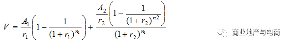 其中A1為現(xiàn)有租約租金收益,r1為租期內(nèi)資本化率,n1為現(xiàn)有租約剩余租期;A2為市場租金水平,r2為租期外資本化率,n2為租約外剩余土地年期。
