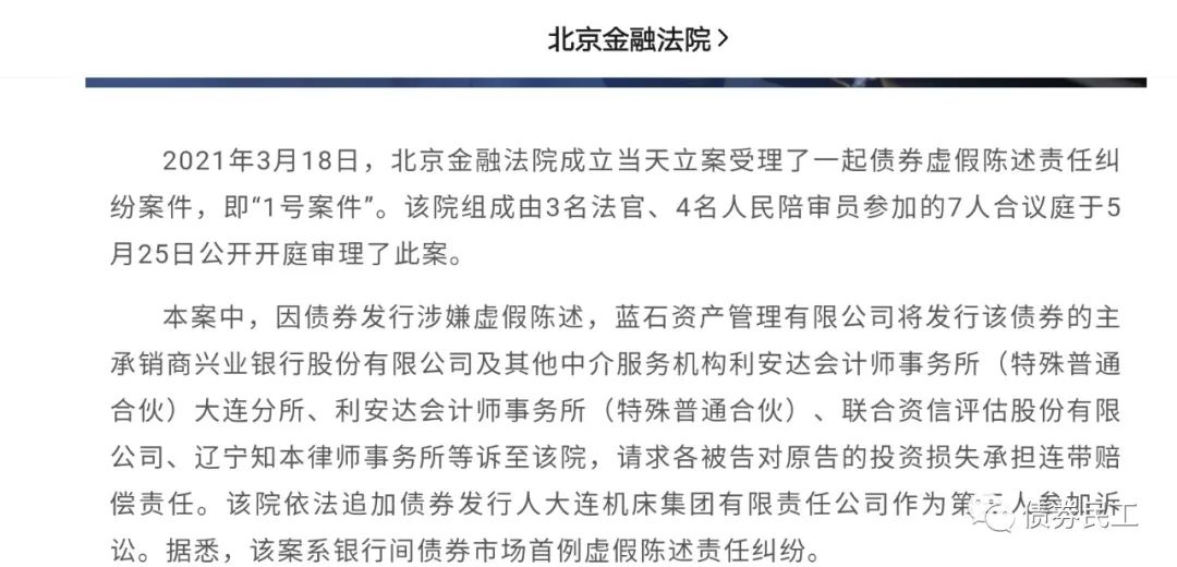 北京金融法院成立于2021年3月18日,成立當(dāng)天即受理了大連機(jī)床債券虛假陳述責(zé)任糾紛案件,是北京金融法院的“1號案”。根據(jù)北京金融法院公開披露的信息,2021年5月25日法院正式開庭審理“1 號案”,大連機(jī)床債券虛假陳述責(zé)任糾紛案件系銀行間債券市場首例虛假陳述責(zé)任糾紛。