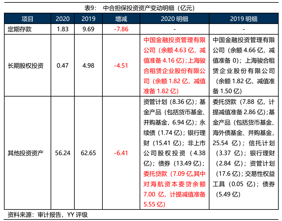 不得不說,中合擔保的投資眼光也不太好,2020年投資收益和公允價值變動收益合計下降2.26億。更為糟糕的是,公司對海航資本的7億元委貸截至2020年末已計提減值準備5.55億,6.45億的長期股權投資截至2020年末已計提減值準備5.98億,這兩塊的計提對2020年大幅虧損“貢獻”巨大。風險敞口方面,對海航資本的委貸賬面價值還剩1.45億,回收率仍不樂觀;長期股權投資已幾乎全部計提;8.36億的資管計劃(投向主要為股權)和4.38億的非上市公司股權投資的質量如何也有待觀察。