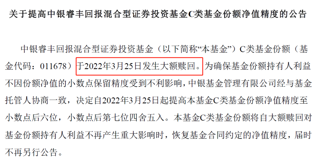 這一背景下,中銀基金旗下“固收+”產(chǎn)品中銀睿豐回報(bào)混合型證券投資基金3月26日公告稱該基金C類份額于3月25日發(fā)生大額贖回。為確保基金份額持有人利益不因份額凈值的小數(shù)點(diǎn)保留精度受到不利影響,決定自3月25日起提高C類基金份額凈值精度至小數(shù)點(diǎn)后六位,小數(shù)點(diǎn)后第七位四舍五入。