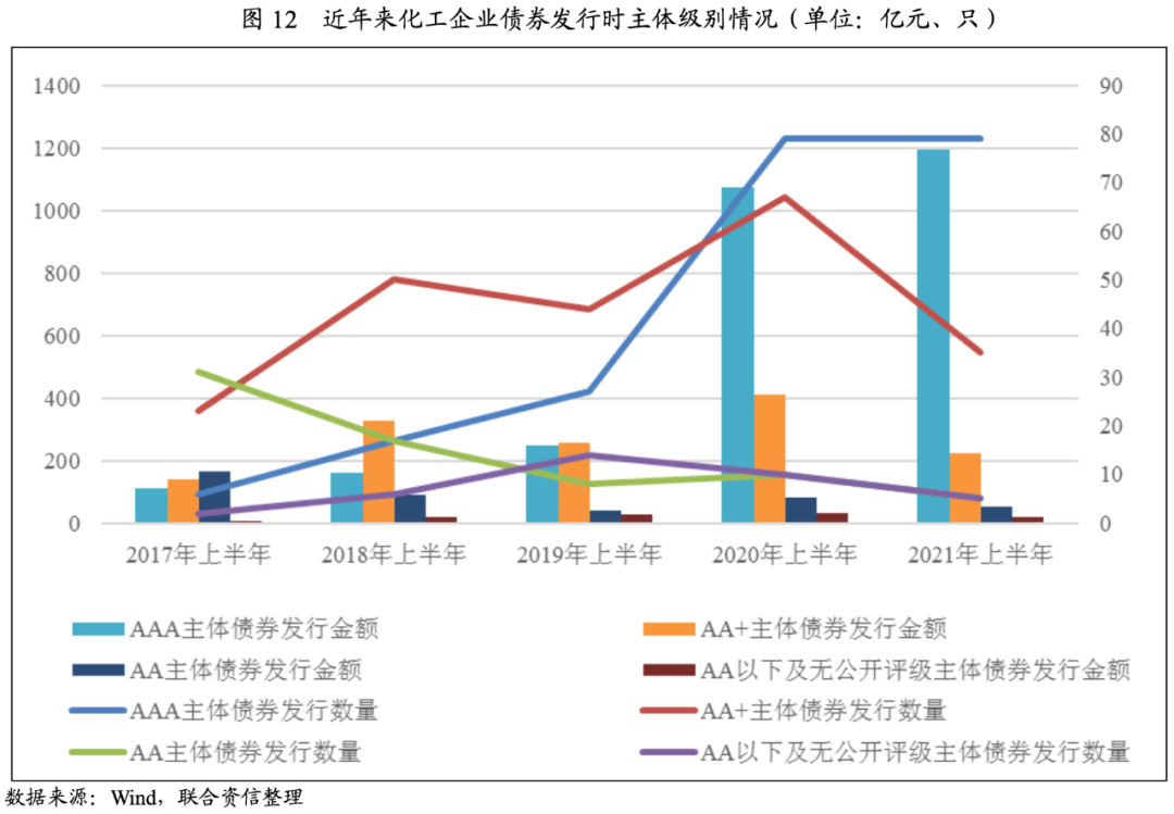 2021年上半年,化工企業債券發行規模回落,但仍為近年來同期高位且民營企業發債規模有所提高,品種仍以短期限債券為主,信用級別主要集中在AA+及AAA級別,但AA+等級發債企業信用利差走闊。