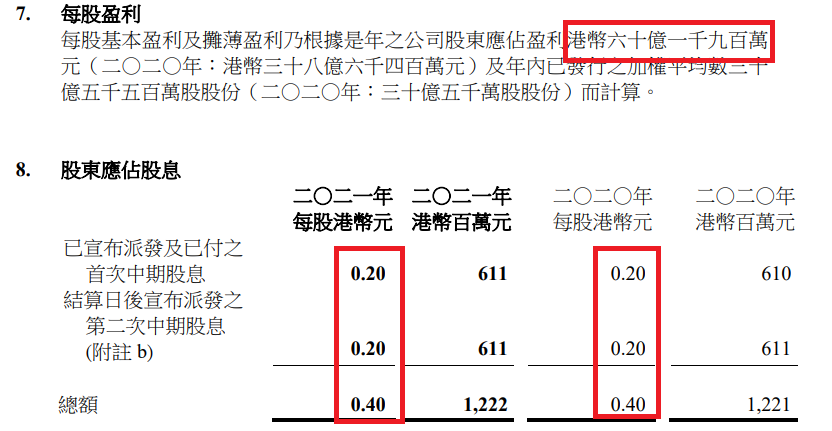 第一次中期股息每股港幣0.20元已于二○二一年九月十五日派付。第二次中期股息每股港幣0.20元將于二○二二年四月二十八日派付予在二○二二年四月八日下午六時正名列股東登記冊內的股東,以代替派付末期股息。二○二一年度每股合共派付股息港幣0.40元(二○二○年:港幣0.40元)。