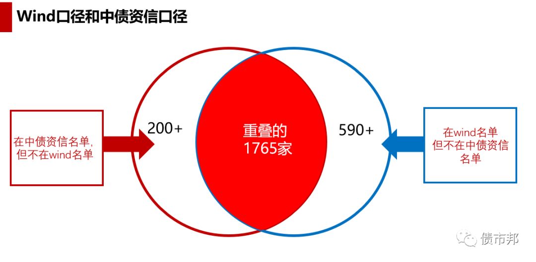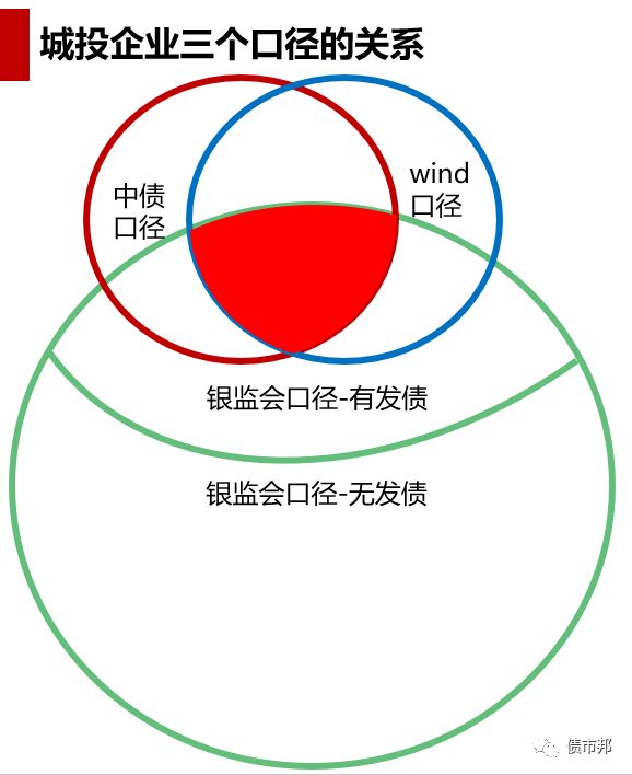 中債資信口徑和Wind口徑的城投債發(fā)行人的關(guān)系如下圖所示,兩者重疊率較高,而wind口徑所納入來的城投債發(fā)行人更多
