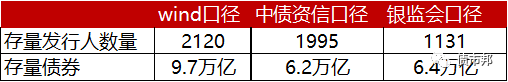 以2019年6月底的城投債存量金額為例,三個口徑的關(guān)系是wind口徑(9.7萬億)>銀保監(jiān)會口徑(6.4萬億)>中債資信口徑(6.2萬億)。wind口徑和中債口徑的差異除了納入城投名單的發(fā)行人不同外,兩者還對同一發(fā)行人的不同債項認(rèn)定方面有差異(其實不太理解對于同一發(fā)行人,為什么中債資信會把部分債項認(rèn)定為是城投債,而對其他債項又認(rèn)為是非城投債)。