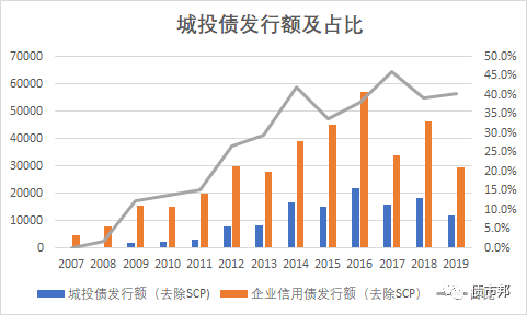 從發(fā)行情況上來看,城投的存在感也是在不斷增強(qiáng)的,占所有企業(yè)類信用債的發(fā)行額的比重逐年上升。在去除超短期融資券SCP發(fā)行量之后,可以看到城投債占企業(yè)類信用債的發(fā)行占比已經(jīng)達(dá)到了40%的比重了。