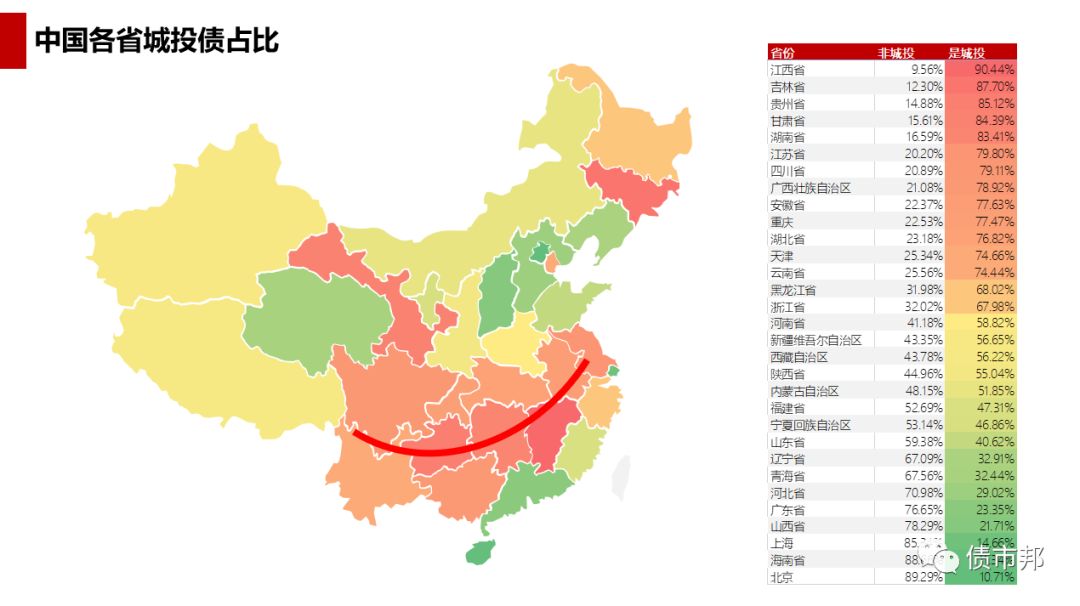 從各地區(qū)城投債占企業(yè)類信用債占比來看,地域分布沒有體現(xiàn)傳統(tǒng)的東、中、西部的地域分布特點,而是差不多沿著長江流域的一個城投走廊(四川、云南、重慶、湖北、湖南、安徽、江蘇等)。