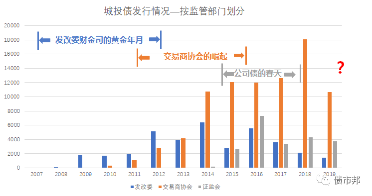 2012年以前城投債是發(fā)改委主管的企業(yè)債獨(dú)領(lǐng)風(fēng)騷,2012至2014年是NAFMII主管的債務(wù)融資工具異軍突起,2015年則是證監(jiān)會主管的公司債接過了城投債增量的大旗。