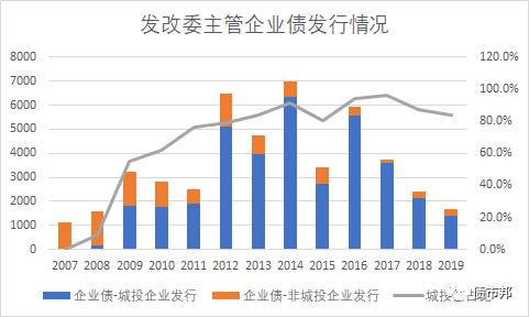 企業(yè)債與NAFMII的債務(wù)融資工具以及證監(jiān)體系公司債的一個最大不同,就是其募集資金用途必須包括項目建設(shè)(主要以基建為主),而這些基建項目的投資主體又是城投企業(yè),因此企業(yè)債是天然契合城投類發(fā)行人的品種。近年來企業(yè)債中的城投發(fā)行金額占比長期保持在80%以上,可以說現(xiàn)在的企業(yè)債幾乎和城投債劃上了等號。