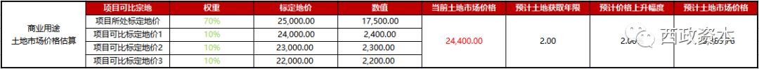 (5)商業用途項目修正系數=∑(各“用地類別或改造類型”面積占比×對應修正因子)=80.5%×0.081+19.5%×0.2=0.065+0.039=0.104