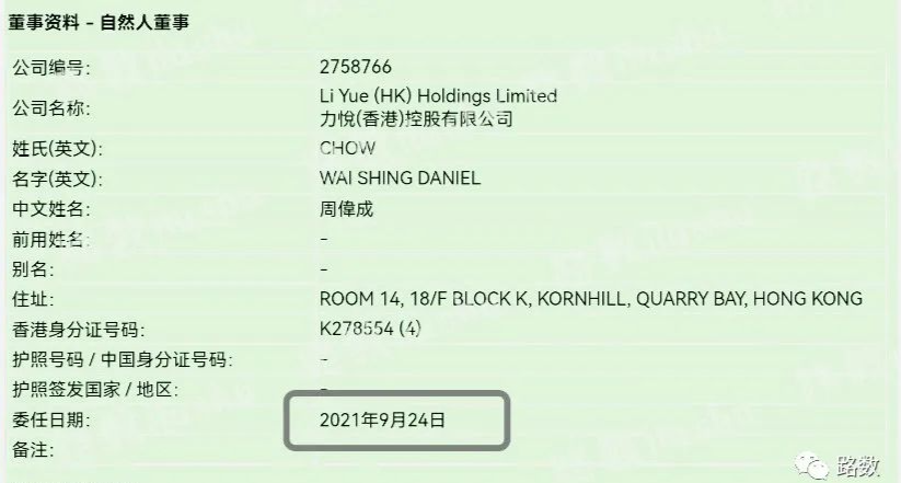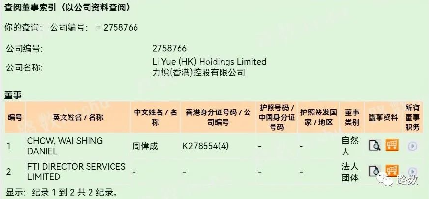 香港查冊中心資料顯示,9月24日,力悅香港的董事變更為自然人周偉成(Chow,Wai Shing Daniel)和法人團體FTI Director Services Limited。▼
