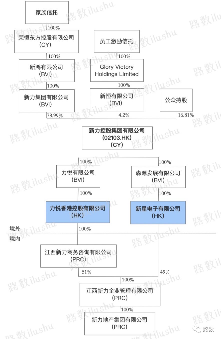 被接管的力悅香港持有新力境內運營主體——新力地產集團有限公司的51%股權。新力地產集團有限公司剩余的49%股權則由新星電子有限公司(Icons Electronics Limited)持有。▼
