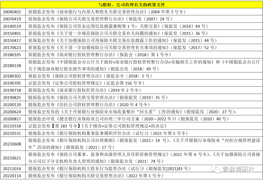 (一)公司治理不完善、股權(quán)不規(guī)范很容易導(dǎo)致金融體系亂象叢生、干擾金融機(jī)構(gòu)正常運(yùn)行,為此近年來(lái)監(jiān)管部門(mén)在金融機(jī)構(gòu)公司治理與股權(quán)行為整頓方面持續(xù)加大力度,并發(fā)布了一系列政策文件進(jìn)行規(guī)范。具體看,