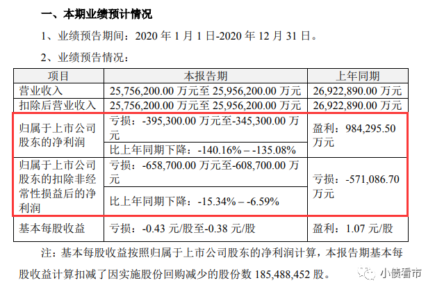 據(jù)《業(yè)績(jī)預(yù)告》顯示,2020年蘇寧易購(gòu)歸屬于上市公司股東的扣非凈利潤(rùn)虧損金額預(yù)計(jì)達(dá)到60.87億-65.87億元。