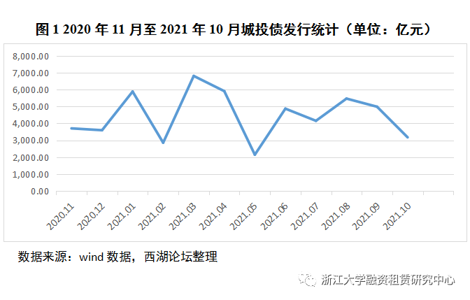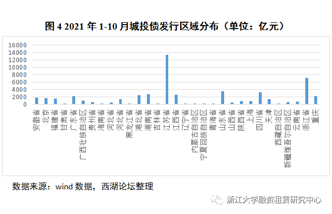 截至2021年10月,城投債發行規模波動較大,3月發行量最高,達到6814.49億,5月發行量最低,2142.42億。值得注意的是,2021年7月“十五號文”發布后,城投債發行量從8月開始逐步下降,說明政策的收緊或許對城投債發行產生實質性影響。