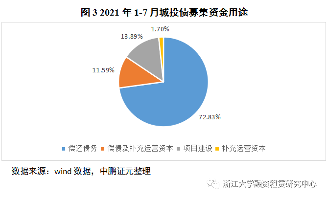 據中證鵬元資信數據顯示,截至2021年7月,城投債資金用途中,借新還舊是城投公司募集資金的主要用途,占比高達72.83%,此數據相較歷年穩步提升。2021年以來,城投公司債發行與監管政策收緊,對于經濟欠發達、債務率較高的地區,城投債發行用途嚴格受限,多以償債為主,進一步體現了監管對遏制增量、化解存量的決心。