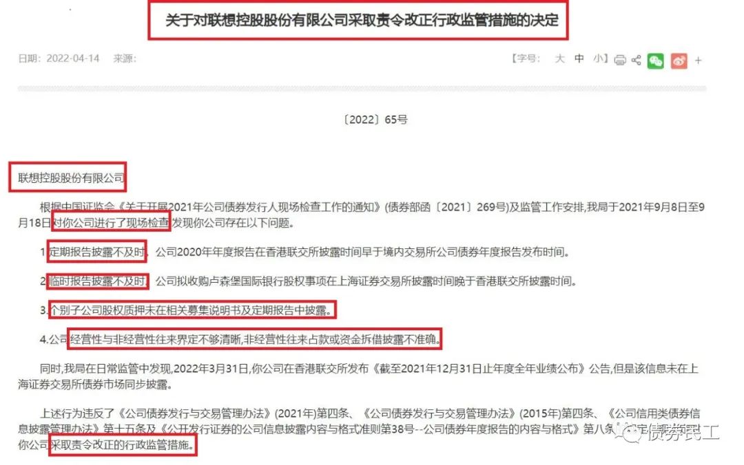 根據(jù)北京證監(jiān)局官方網(wǎng)站2022年4月14日披露的信息,聯(lián)想控股股份有限公司(以下簡稱“聯(lián)想控股”)被采取責(zé)令改正行政監(jiān)管措施,主要原因是定期報告披露不及時、臨時報告披露不及時、經(jīng)營性與非經(jīng)營性往來界定不夠清晰等。
