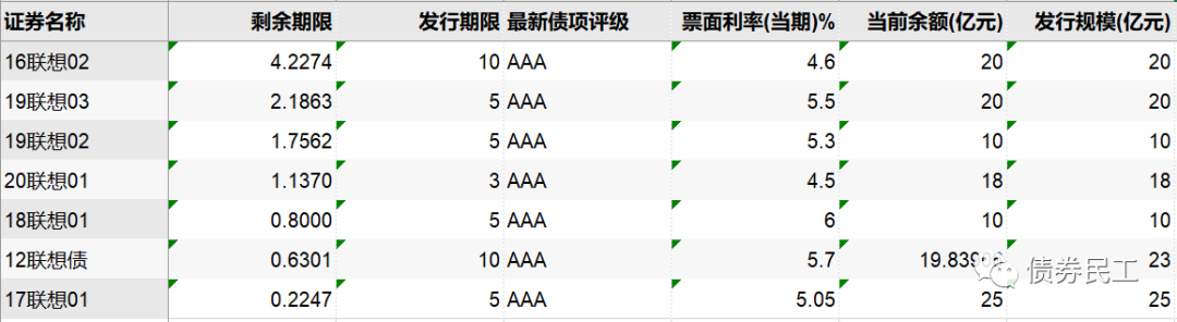 聯(lián)想控股的主體信用等級為AAA(聯(lián)合資信)。聯(lián)想控股存續(xù)債券為7只,存續(xù)債券金額為122.84億元,存續(xù)債券產(chǎn)品為小公募公司債券和企業(yè)債券,債券期限均為中長期債券。