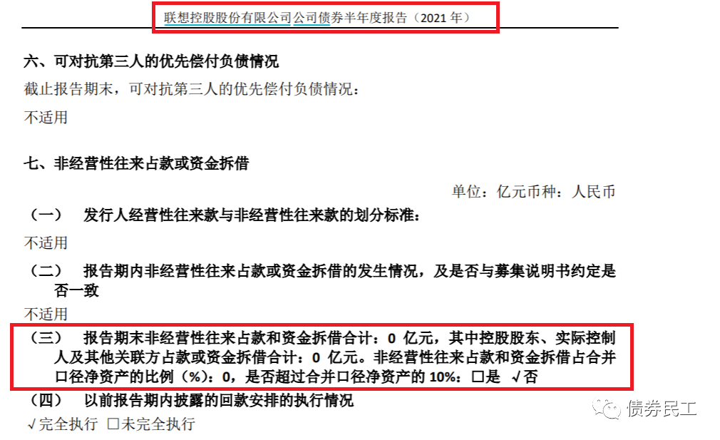 根據(jù)聯(lián)想控股2021年8月31日披露的公司債券半年度報告,截至2021年6月末,公司的非經(jīng)營性往來款和資金拆借金額為0億元,也就是說不存在非經(jīng)營性往來款和資金拆借金。