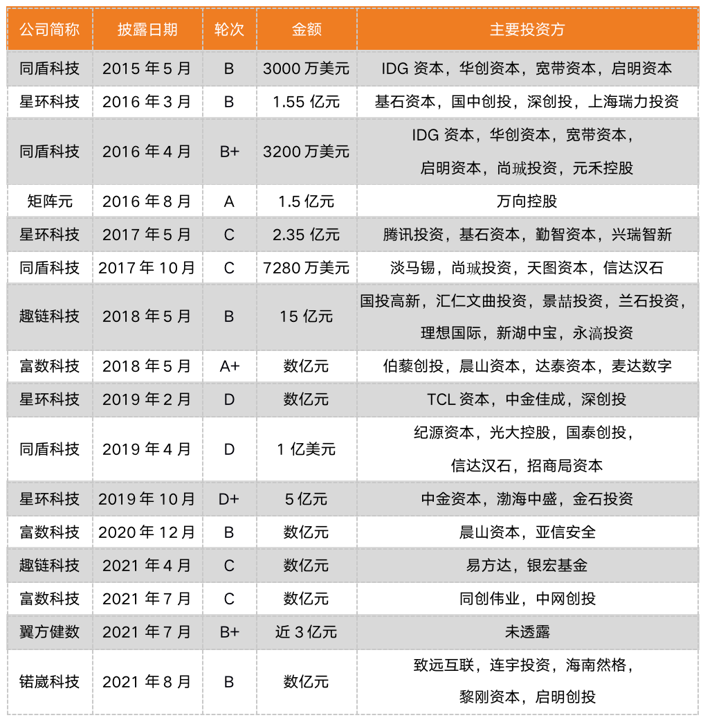 從時間維度上看,2017年有2家隱私計算公司進(jìn)入C輪融資階段:星環(huán)科技和同盾科技,它們在2019年又各自完成了2輪D系列融資。時隔近四年,趣鏈科技和富數(shù)科技相繼在2021年完成數(shù)億元C輪融資。早期融資持續(xù)活躍,中后期融資陸續(xù)出現(xiàn)。
