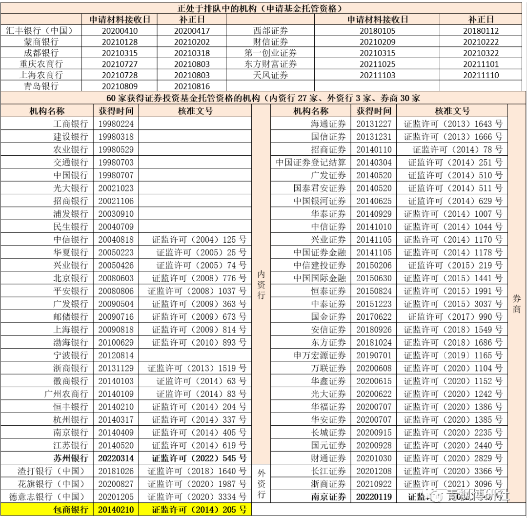 除上述60家已獲得基金托管資格的機構(gòu)外,還有11家正處于申請基金托管資格的排隊序列中,具體包括5家內(nèi)資行、1家外資行和5家券商。