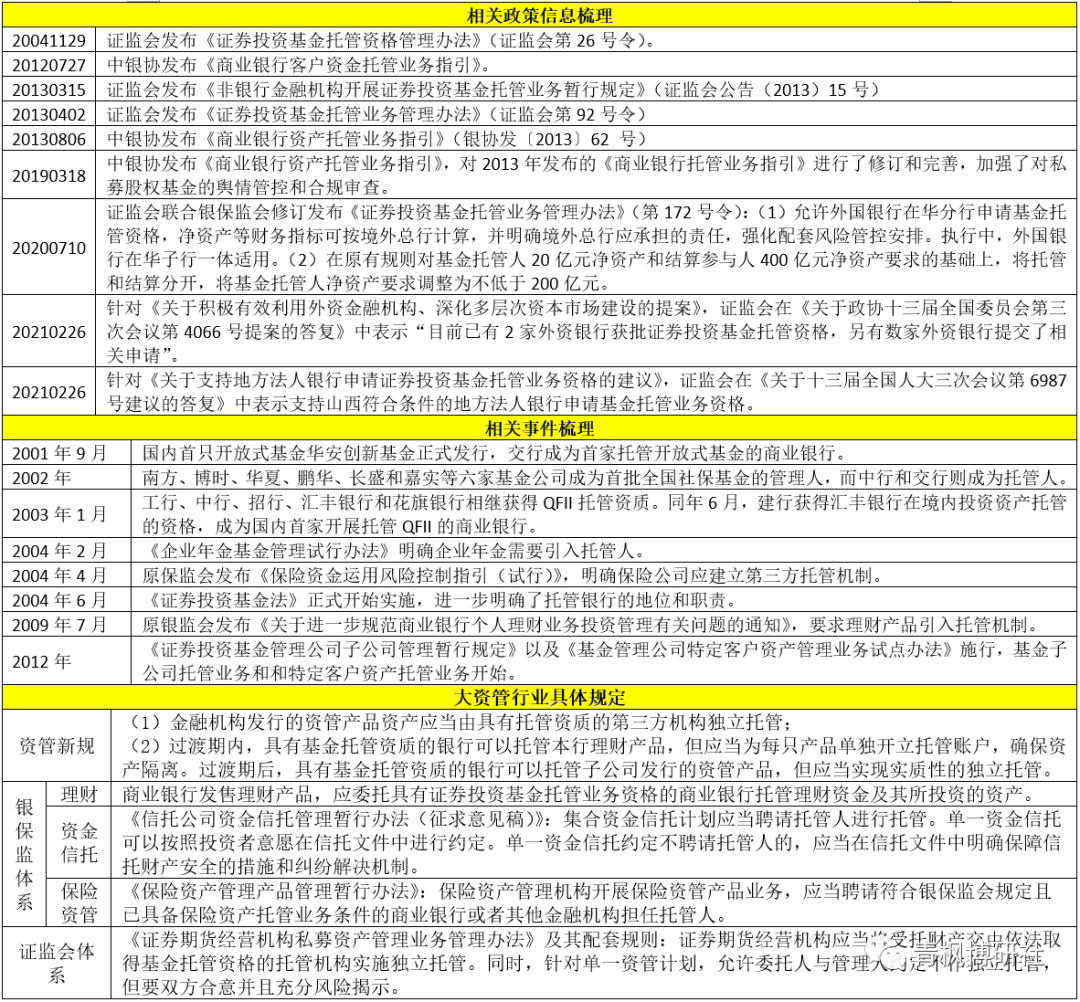 1、國內(nèi)基金托管牌照始于1998年,最終只有工農(nóng)中建交等五大行被授予該資質(zhì),隨后于2002年進一步擴大至股份行。
