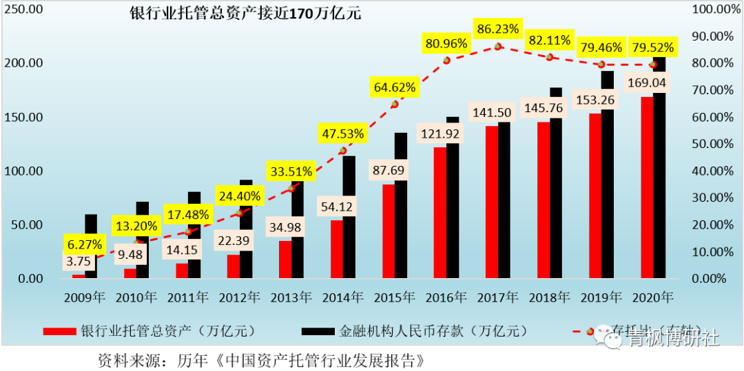 2、與之相對比,較高的托管規(guī)模增長步伐也有效提升了存托比,其從2009年的不到10%提升至2017年的86.23%。隨后在強監(jiān)管的背景下,資管產(chǎn)品出現(xiàn)一定程度的萎縮,托管規(guī)模的增長步伐有所放緩,使得存托比亦相應(yīng)下降至2018年的82.11%和2019年的79.46%,2020年則微幅抬升至79.52%。