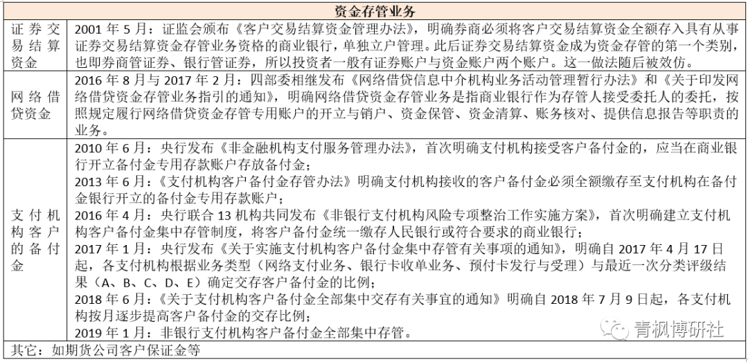 (1)資金存管不對交易的實質(zhì)進行審核,且針對性往往較強,其目的是為了防止客戶資金被挪用,主要包括證券客戶的交易結(jié)算資金、網(wǎng)絡(luò)借貸資金、支付機構(gòu)客戶的備付金以及風險保障基金等等。