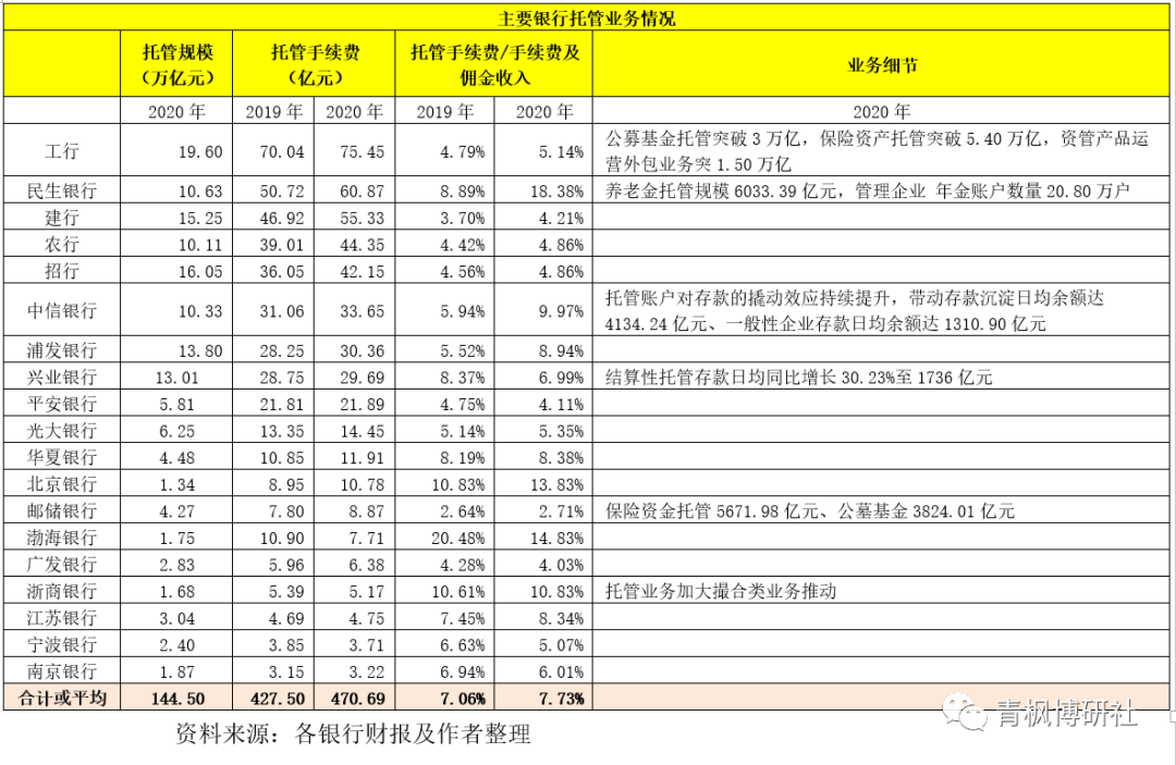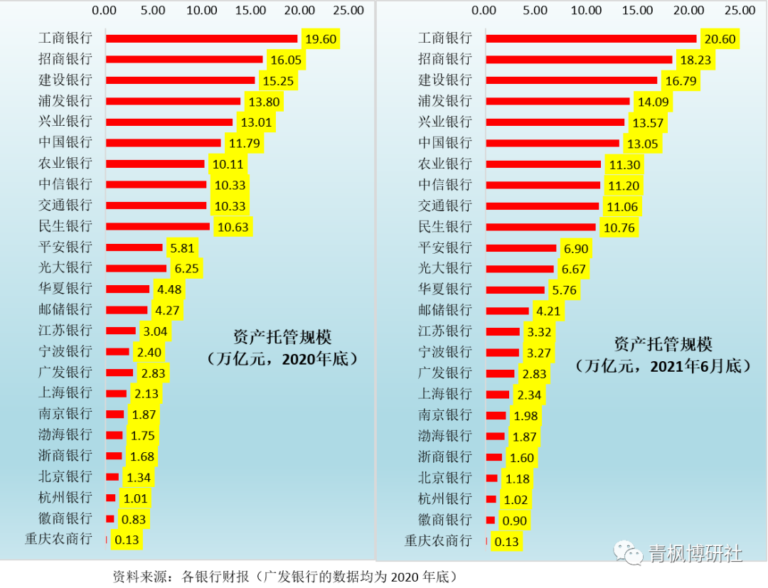1、25家銀行在2020年底與2021年6月底的資產(chǎn)托管規(guī)模合計分別為170.72萬億和184.63萬億元,進一步印證目前銀行業(yè)托管資產(chǎn)規(guī)模應(yīng)在185萬億左右。