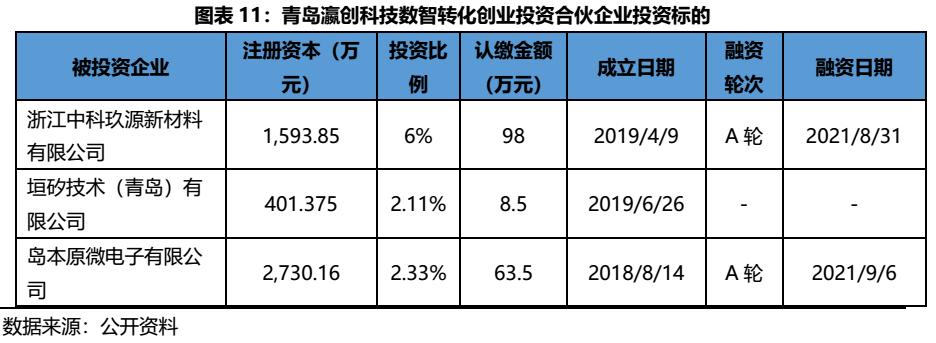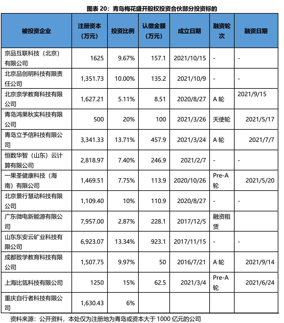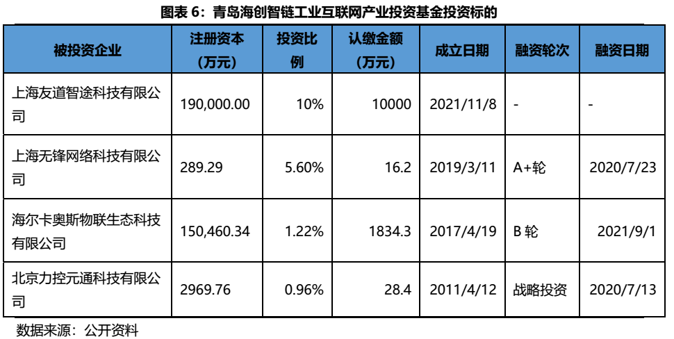 在分析后發現,青島科創母基金作為2019年開始的基金,仍處于一期投資階段;在其自身和投資對象的股東中,可以看見青島巨峰科技、青島城投、青島國信、青島城陽開發、山東高速、青島海洋科技、青島海發、青島投資、城發投資等城投的身影;而作為青島科創母基金四大投資方向,工業互聯網、先進制造、新基建和生命科學,目前投資集中在工業互聯網,而新基建部分金額相對較少。投資的主體大多處于A輪或B輪融資階段,產業化參與較深。