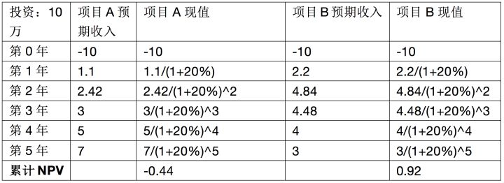 可以看到項目A凈現(xiàn)值為負(fù),項目B凈現(xiàn)值為正,這說明項目A的內(nèi)部報酬率(IRR)將小于20%,而項目B的內(nèi)部報酬率大于20%。